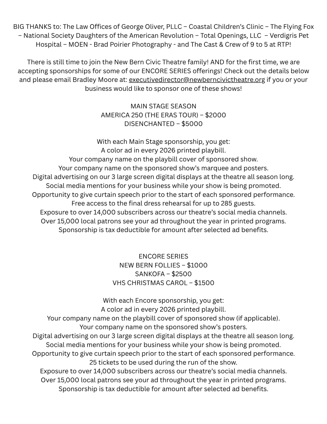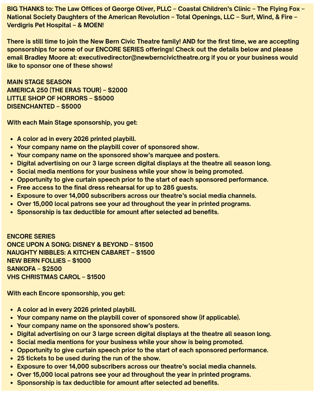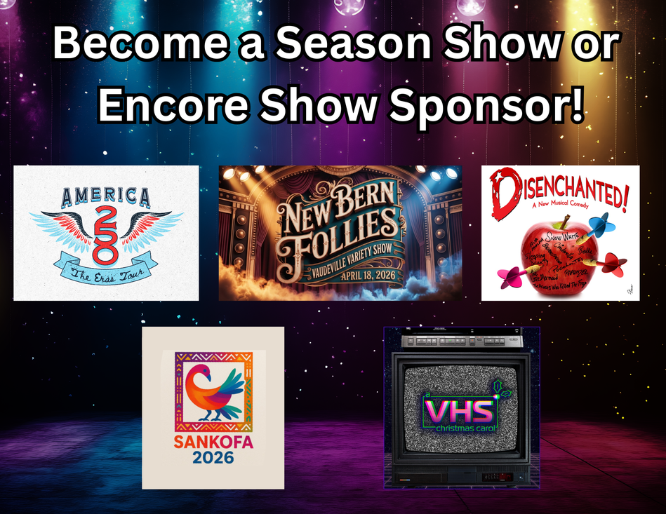 New Bern Civic Theatre is a 501(c)(3) non-profit organization. All contributions are tax-deductible to the fullest extent allowed by law. Financial information about this organization and a copy of its license are available from the State Solicitation Licensing Branch at 1-888-830-4989. The license is not an endorsement by the state.