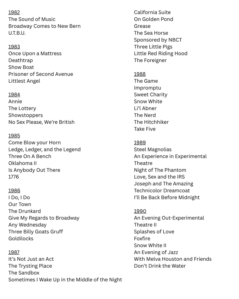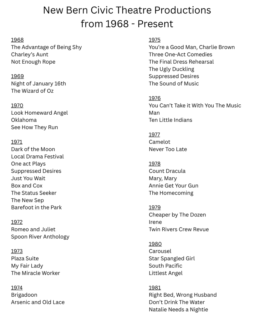 New Bern Civic Theatre is a 501(c)(3) non-profit organization. All contributions are tax-deductible to the fullest extent allowed by law. Financial information about this organization and a copy of its license are available from the State Solicitation Licensing Branch at 1-888-830-4989. The license is not an endorsement by the state.
