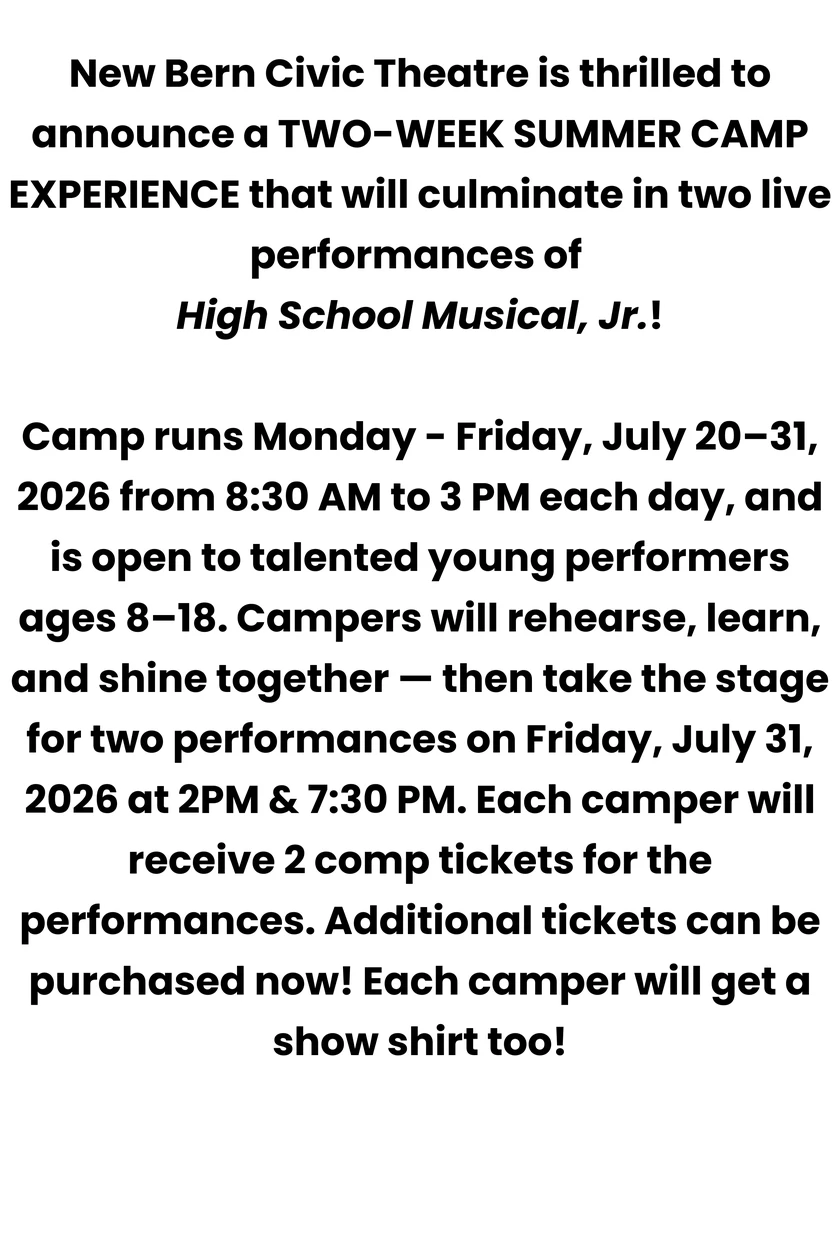 New Bern Civic Theatre is a 501(c)(3) non-profit organization. All contributions are tax-deductible to the fullest extent allowed by law. Financial information about this organization and a copy of its license are available from the State Solicitation Licensing Branch at 1-888-830-4989. The license is not an endorsement by the state.